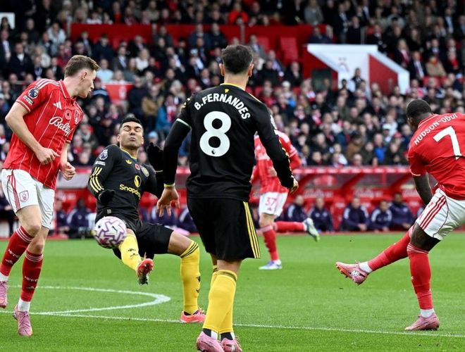 第28分钟,阿马德-迪亚洛在禁区外起脚远射,门将飞身把球扑出。6分钟后,曼联进球了!布鲁诺-费尔南德斯开出角球,卡塞米罗高高跃起,头球攻门,皮球弹地后钻入球门远角。曼联取得领先。第41分钟,阿马德-迪亚洛在禁区外尝试一脚远射,踢飞了。半场结束,曼联1-0领先诺丁汉森林。